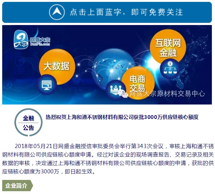 熱烈祝賀上海和通不銹鋼材料有限公司獲批3000萬供應(yīng)鏈核心額度